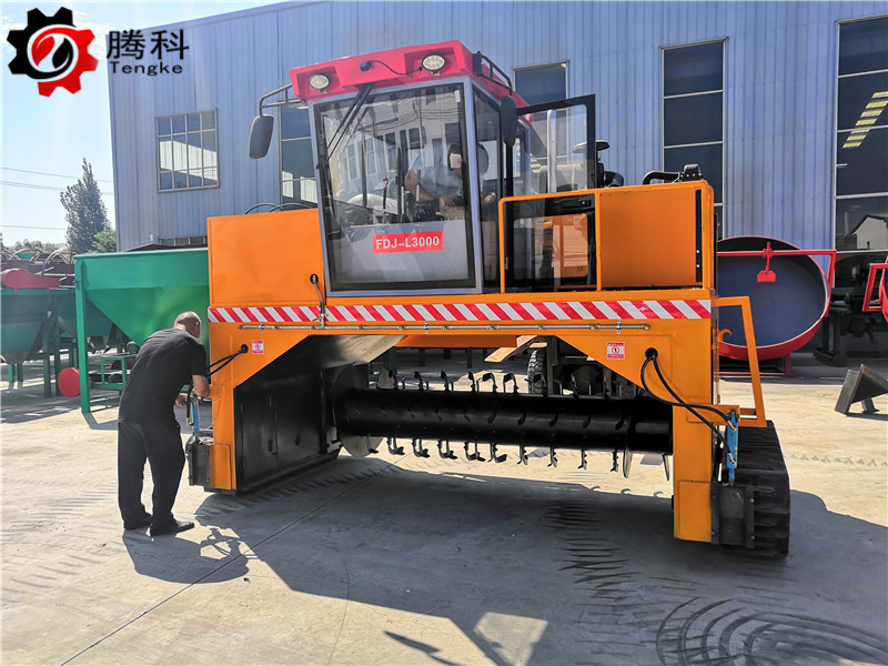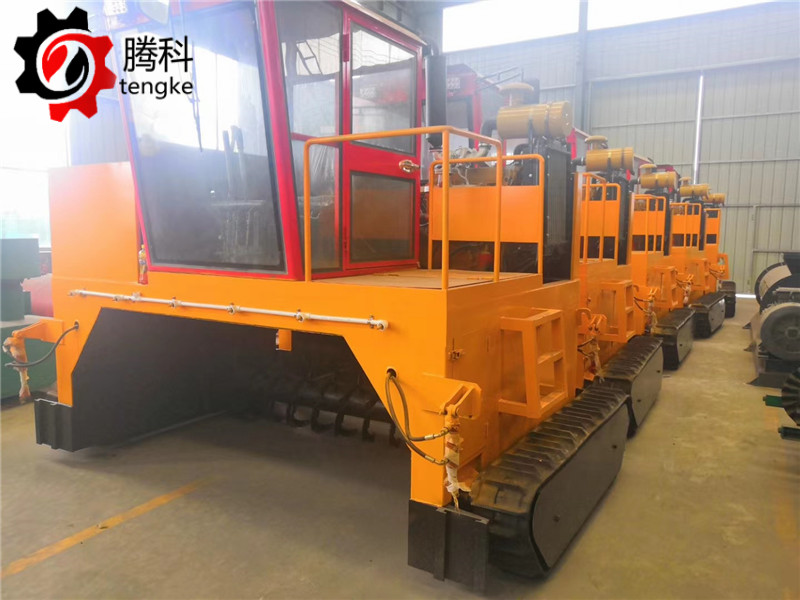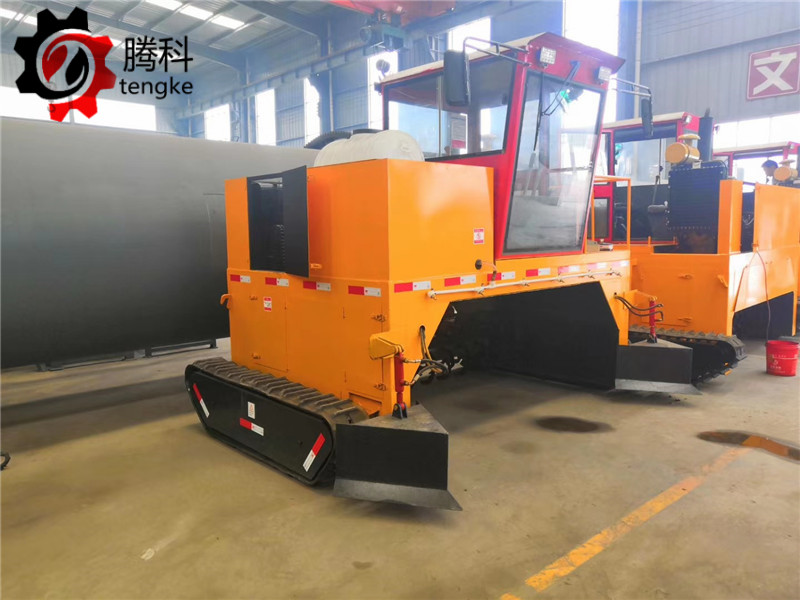 有机肥履带式翻抛机(翻堆机)属于地面堆放发酵模式,是目前较节省土建、人力资源的一种制肥模式。需将物料堆成长形条垛由翻抛机定时对物料实施搅拌、破碎,在好氧条件下进行有机物的分解。履带式翻堆机采用履带传动设计,一人即可操作。当它工作时,履带跨在条状堆肥堆上,机架下端的刀轴旋转对原料进行混合和翻堆。操作不仅可以在露天区域完成,也可以在车间或者温室完成。履带式翻抛机的技术是集成了物料发酵后期的破碎功能,随着物料的连续翻堆,刀轴能有效粉碎原料发酵过程中形成的结块。翻堆机工作时可以很有效地把污泥、粘稠鸡粪等物料与菌种、秸秆粉搅拌均匀。为物料发酵创造了更好的好氧环境。不仅比深槽发酵速度快的多,还防止了发酵过程中硫化氢、胺气、吲哚等有害、恶臭气体的产生,符合环保要求。